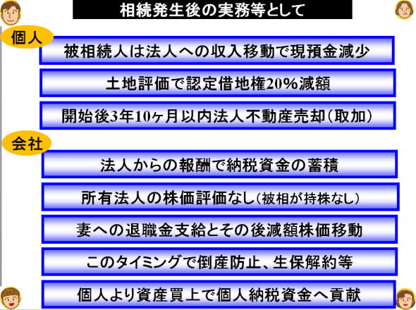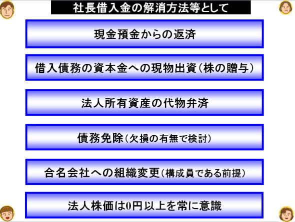 であれば、こうした返済不能部分に関しては、確定日付を付けた書面により会社に対して債権放棄をしておくことです。もちろん、この場合には会社側であらかじめ損失を合法的な方法で故意に作っておく必要がありますが、ない場合でも代表者に対する退職金を所得税の非課税額の範囲内で支給や、不良債権、不良在庫などの処分など考えられる方法で、赤字を出し、それと債務免除益とを相殺する手法などが考えられますが、その場合にも事前の計画性が重要となってきます。