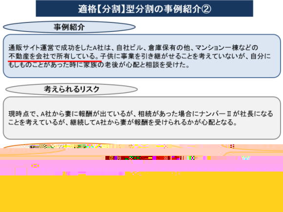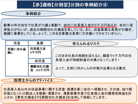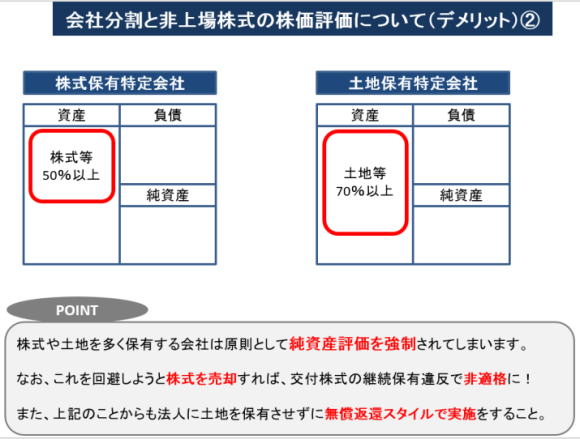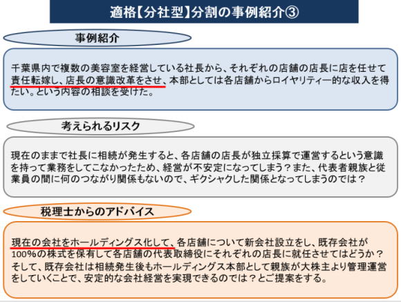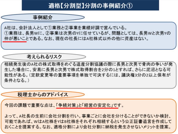 下記の内容は、平成28年9月2日 横浜ローズホテルで全国税理士集会向けの研究発表をした際の資料として利用をしたものでご紹介をさせていただきます。なお、完全支配関係での組織再編税制の活用を利用した会社分割でのご案内となります。